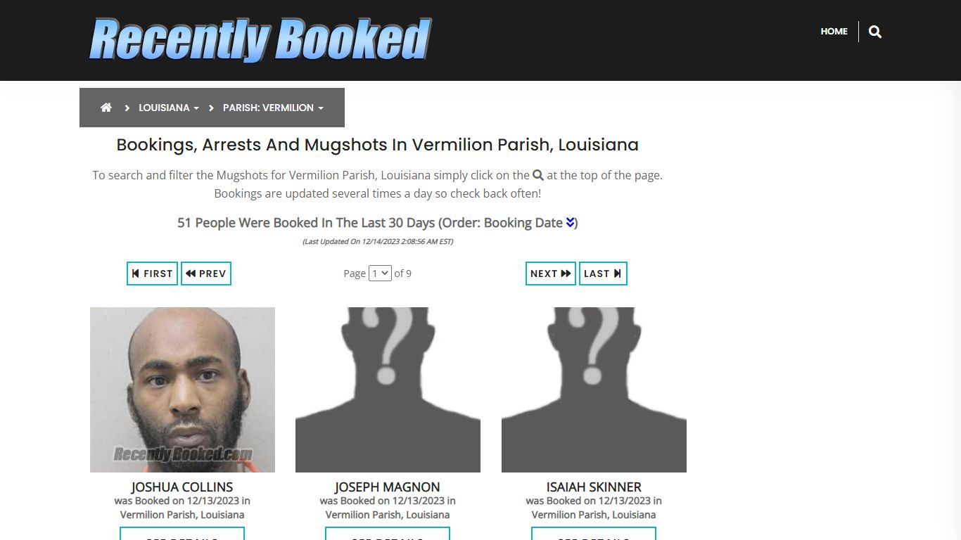 To search and filter the Mugshots for Vermilion Parish, Louisiana simply click on the at the top of the page. Bookings are updated several times a day so check back often! 54 people were booked in the last 30 days (Order: Booking Date ) (Last updated on 12/2/2023 2:07:30 AM EST) First Prev Page of 9 Next Last KALEY COOPER